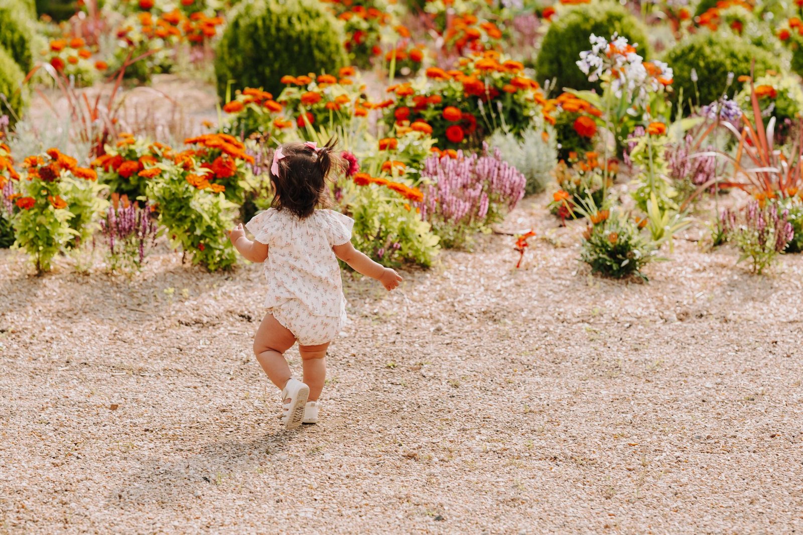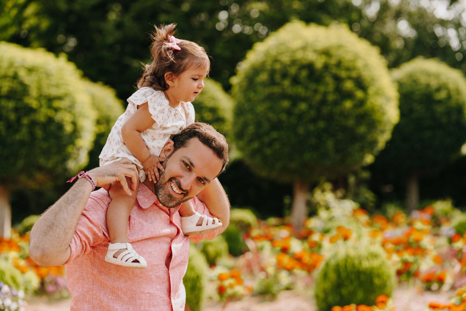 Nous avons ensuite rejoint le parc de Sceaux. Contrairement au printemps, où il est bondé, l’été offre un calme presque surprenant. Pas de lavande cette fois (elle change d’emplacement chaque année !), mais des fleurs orangées et vertes à couper le souffle. Leur choix de tenues corail s’accordait parfaitement avec le décor : un rendu lumineux, doux et coloré.